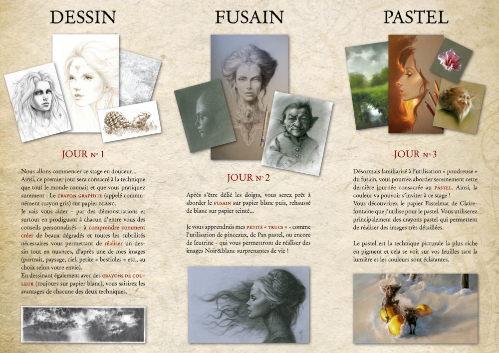 Sandrine Gestin organise un stage de 3 jours à Lausanne, dans la Ferme du Désert les 20, 21 et 22 octobre 2018, ainsi que les 20, 21 et 22 avril 2019. Si son stage des "3 techniques" des 20, 21 et 22 avril 2019 est quasi plein, il reste heureusement encore des places les 20, 21 et 22 octobre 2018. Si vous loupez ces dates, il faudra s'en doute attendre 2020 pour que Sandrine revienne en Suisse, alors n'hésitez plus. Pour rappel, il s'agit d'un stage de 3 jours où seront abordées 3 techniques, le dessin au crayon, le fusain et le pastel (sec). Une technique par jour et n'oubliez pas que tout le matériel est fourni. Tous les renseignements utiles et nécessaires sont sur le site officiel de Sandrine Gestin.