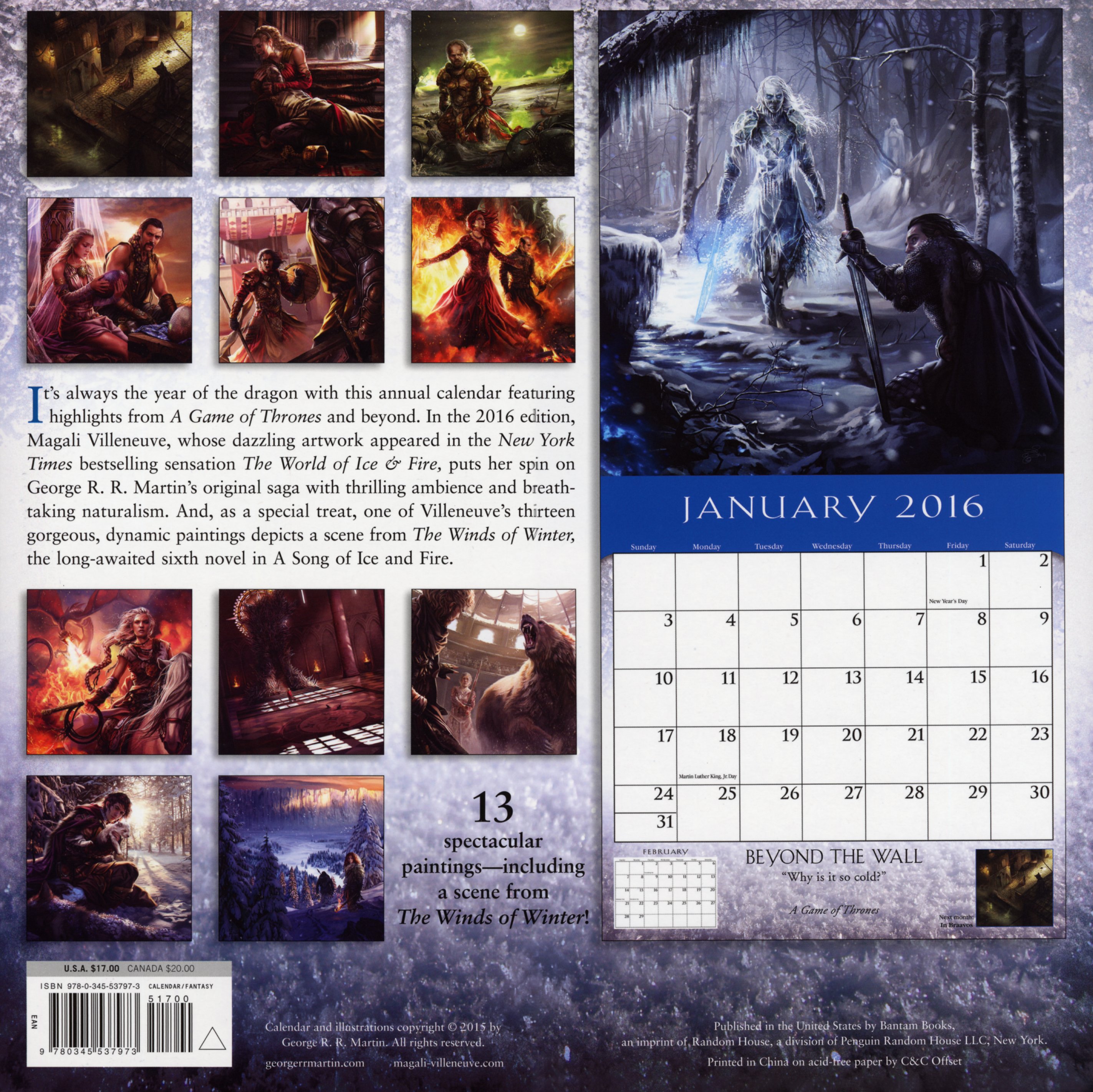 C’est toujours l’année du dragon avec ce calendrier annuel mettant en vedette les moments forts de la saga A Game of Thrones et bien au-delà. Dans l'édition 2016 du calendrier A Song of Ice and Fire, Magali Villeneuve, dont les œuvres éblouissantes sont apparues dans The World of Ice & Fire, met en valeur la célèbre série de George R. R. Martin avec une ambiance palpitante et un naturalisme à couper le souffle. Et, à titre de cadeau spécial, l’un des treize magnifiques tableaux de magali Villeneuve représente une scène des Vents d’hiver, le sixième roman tant attendu dans A Song of Ice and Fire.