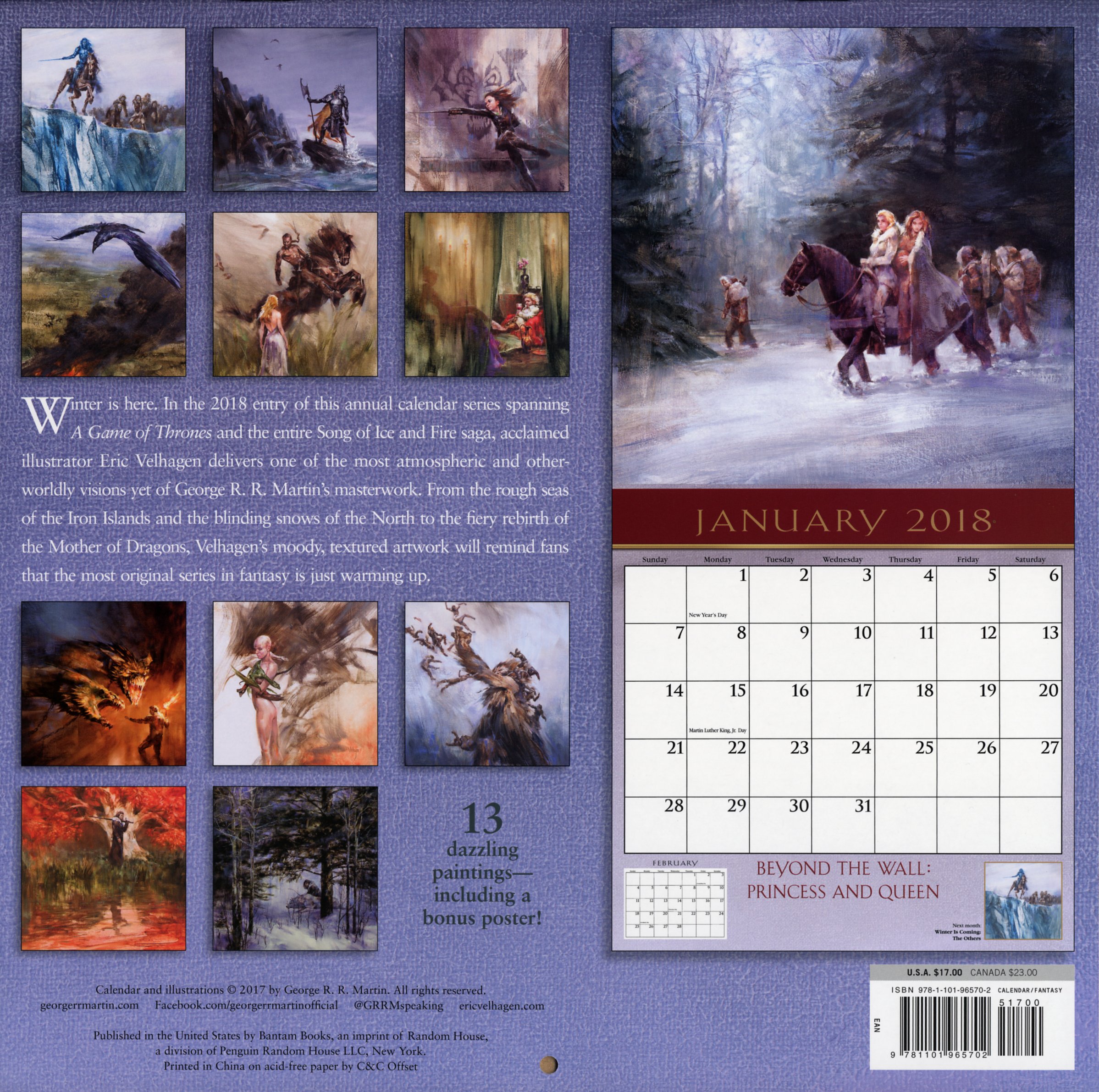 L’hiver est arrivé ici. Dans l’édition 2018 de la collection annuelle de calendriers allant de la saga A Game of Thrones à la célèbre série A Song of Ice and Fire, l’illustrateur Eric Velhagen livre l’une des visions les plus atmosphériques et surnaturelles du chef-d’œuvre de George R. R. Martin. Des mers agitées des Iles de fer aux neiges aveuglantes du Nord en passant par la renaissance enflammée de la Mère des dragons, les œuvres maussades et texturées d’Eric Velhagen rappelleront aux fans que la série la plus originale de la fantasy ne fait que se réchauffer.