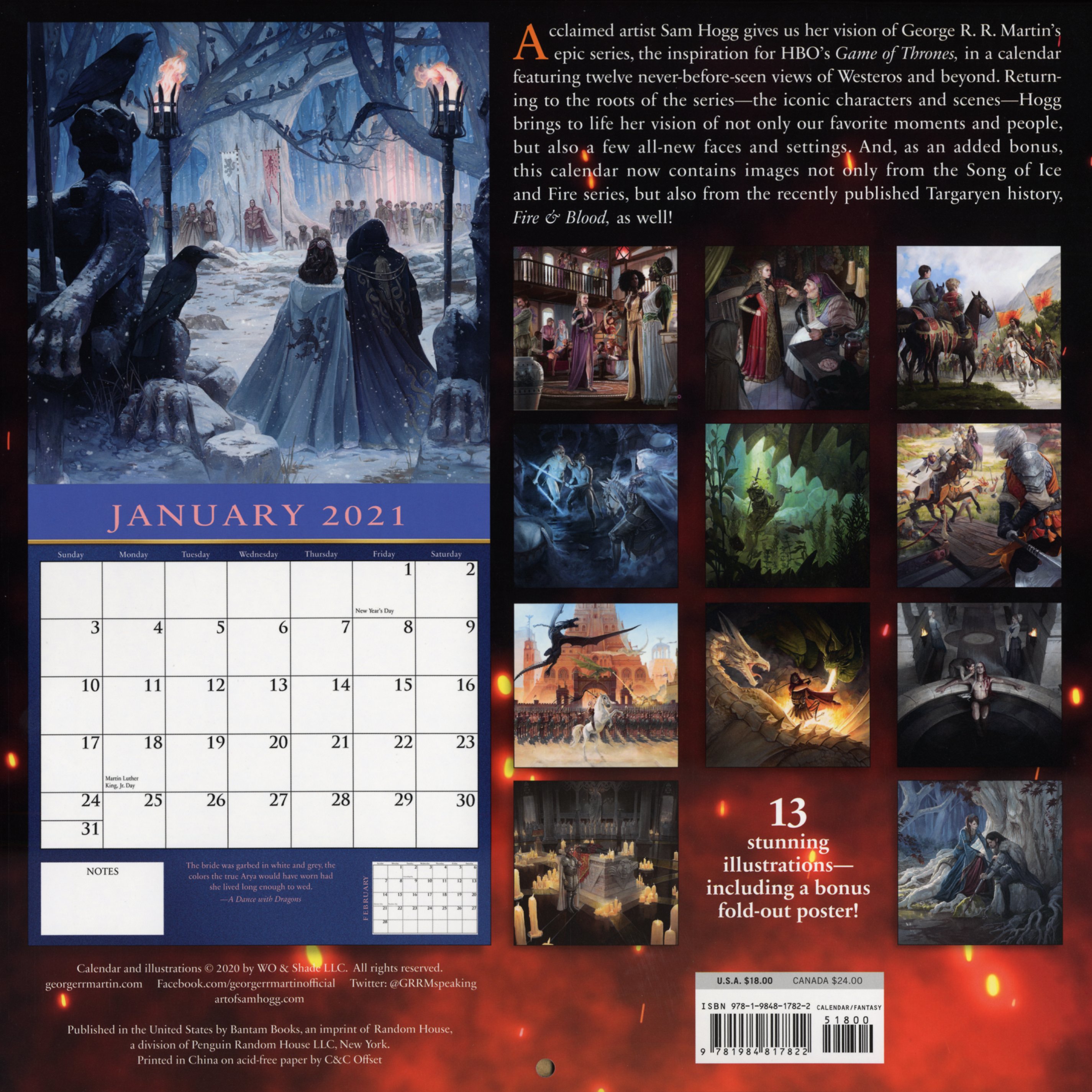 L'artiste de renom Sam Hogg nous livre sa vision de la saga épique de George RR Martin, l'inspiration de la série Game of Thrones de HBO, dans un calendrier présentant douze vues inédites et un poster central de l’univers de Westeros et même au-delà. Revenant aux racines de la série, les personnages et scènes emblématiques, Sam Hogg donne vie non seulement à nos moments et à nos personnages préférés, mais aussi à quelques visages et décors tout nouveaux. En effet, si cette nouvelle édition 2021 contient toujours les habituelles illustrations de la série A Song of Ice and Fire, elle propose également celles de l'histoire du règne des rois Targaryen récemment publiée, Fire & Blood !