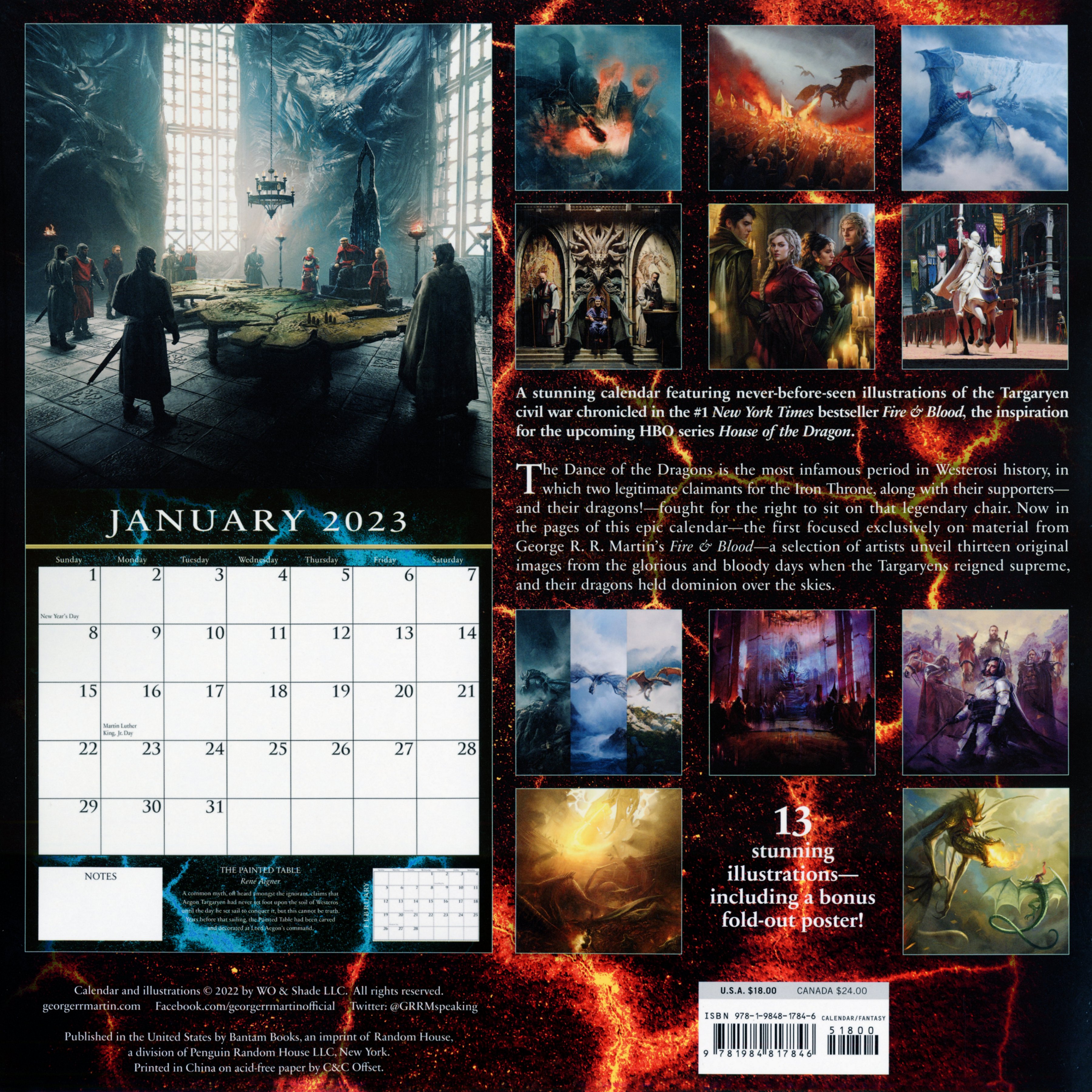 L’édition 2023 du calendrier A Song of Ice and Fire, intitulée pour l’occasion The World of Fire & Blood, présente des illustrations inédites de la guerre civile des Targaryens racontée dans le 1er tome de Feu et Sang (Fire & Blood), le best-seller du New York Times, à l’origine de la prochaine série de HBO, House of the Dragon.