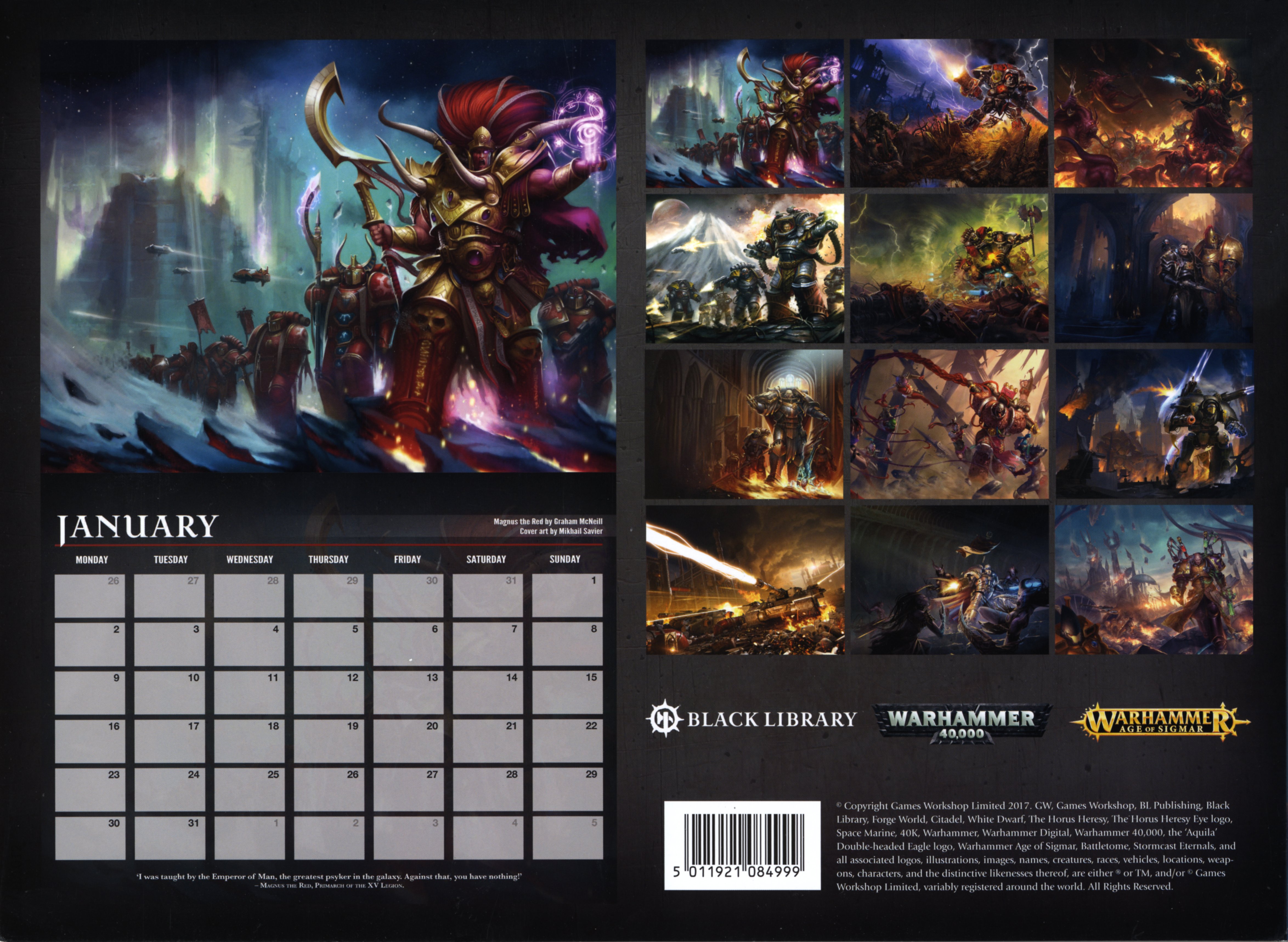 Le calendrier Black Library 2017 propose quelques-unes des plus belles illustrations en couleur des artistes les plus talentueux de Games Workshop avec une petite préférence pour les héros et les batailles de Warhammer 40,000 et Warhammer Age of Sigmar.