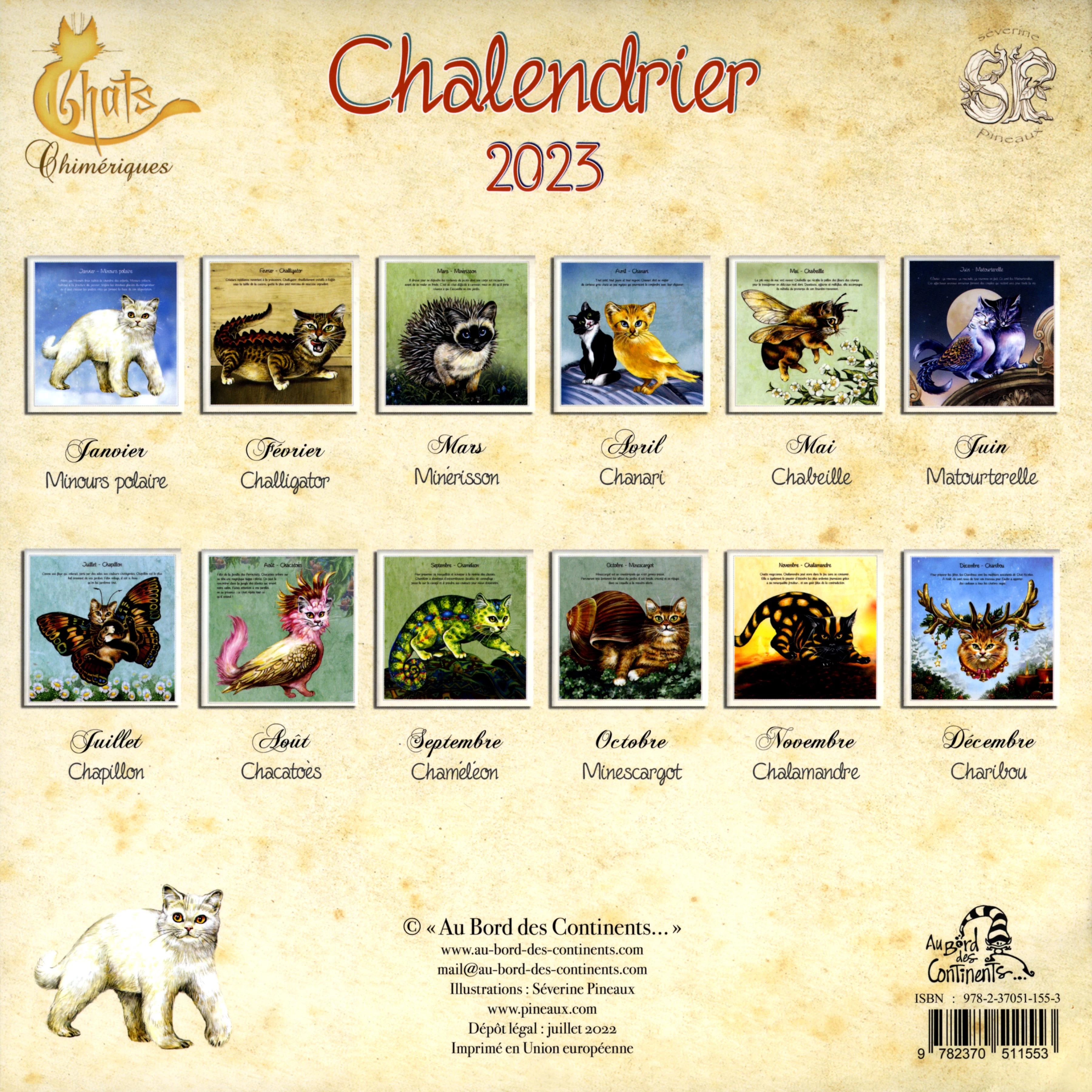 Séverine Pineaux a décidé de placer l'année 2023 des chats sous le signe des hybrides avec ce nouveau calendrier des Chats chimériques, qui va vous permettre de découvrir les plus drôles et les plus attachantes créatures issues de chats. Plein d'humour et de tendresse, le magnifique Chalendrier 2023 vous embarque pour une année pleine d’énergie où vous attendent Minérisson, Chabeille, Challigator, Chaméléon, Chalamandre, Chacatoès et leurs amis.
