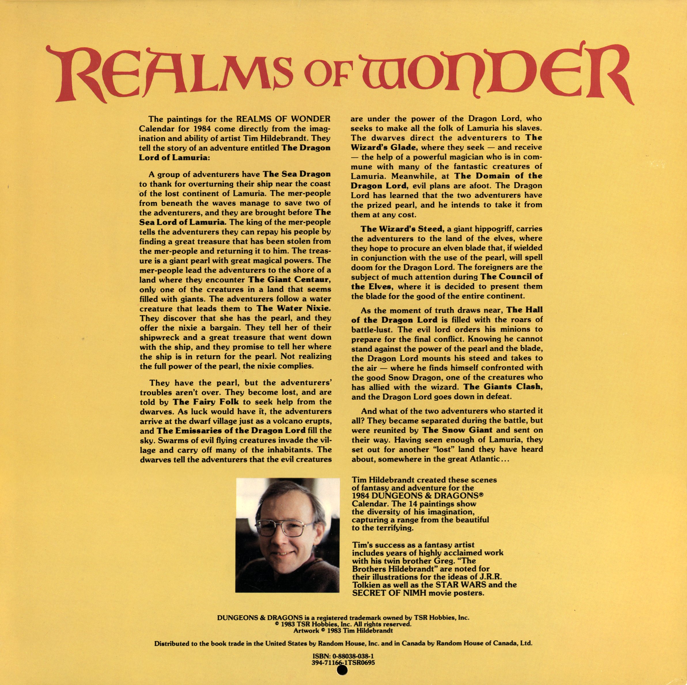Edition 1984 de la collection des calendriers TSR. Les oeuvres du calendrier Realms of Wonder 1984 sont directement issues de l'imagination et des compétences de Tim Hildebrandt. Elles racontent l'histoire de l’aventure intitulée The Dragon Lord of Lamuria.