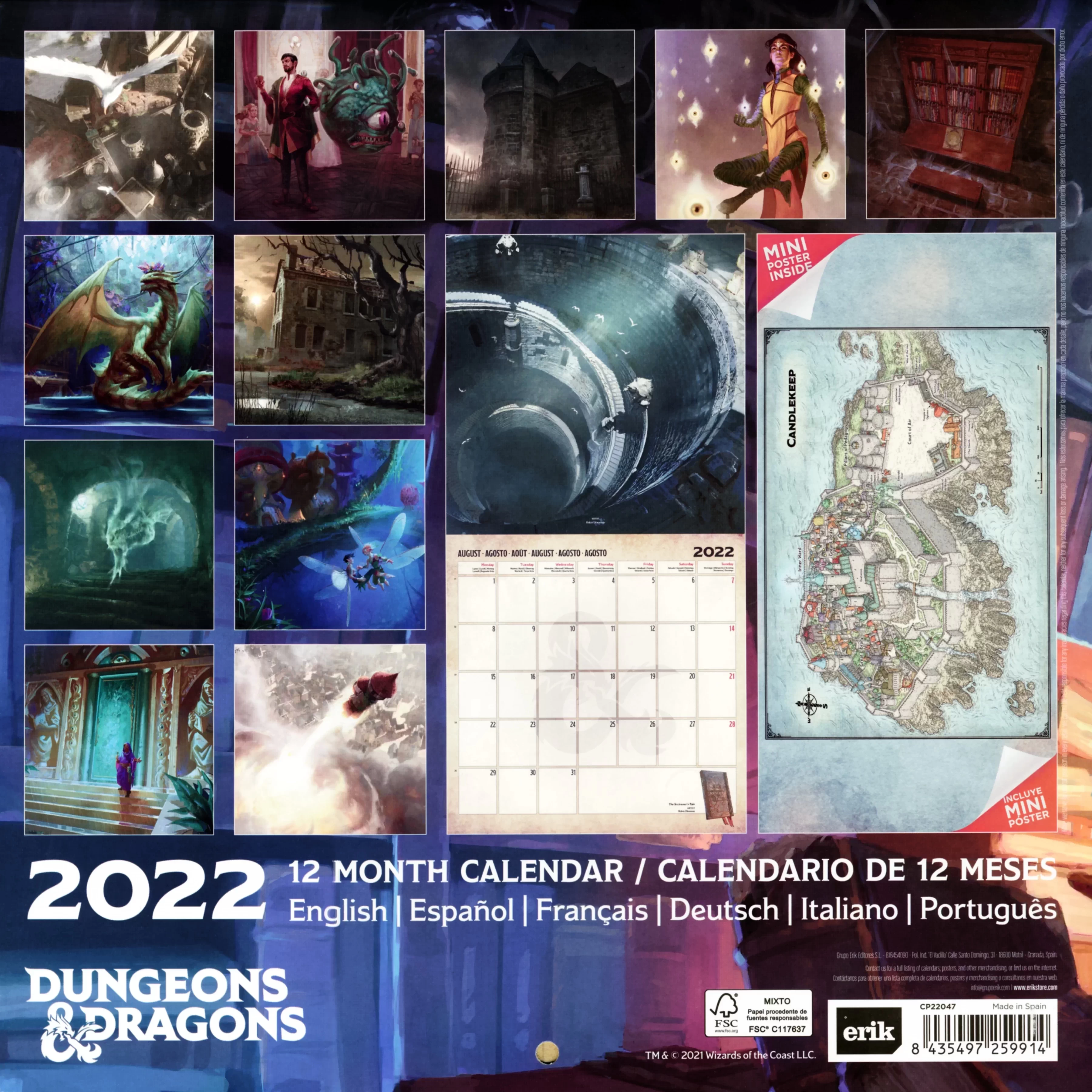 Cette édition 2022 de la série des calendriers Dungeons & Dragons, au thème particulier, propose douze illustrations tirées de Candlekeep Mysteries. L’anthologie d'aventures courtes et mystérieuses écrites par les membres de la communauté Dungeons & Dragons, est une histoire de livres, des grands livres qui cachent bien leurs secrets. 17 aventures mystérieuses dans lesquelles se croisent aventuriers, monstres et objets magiques que vous pourrez découvrir en images dans ce calendrier 2022, sans oublier en poster central, la magnifique carte de Candlekeep réalisée par Mike Schley.