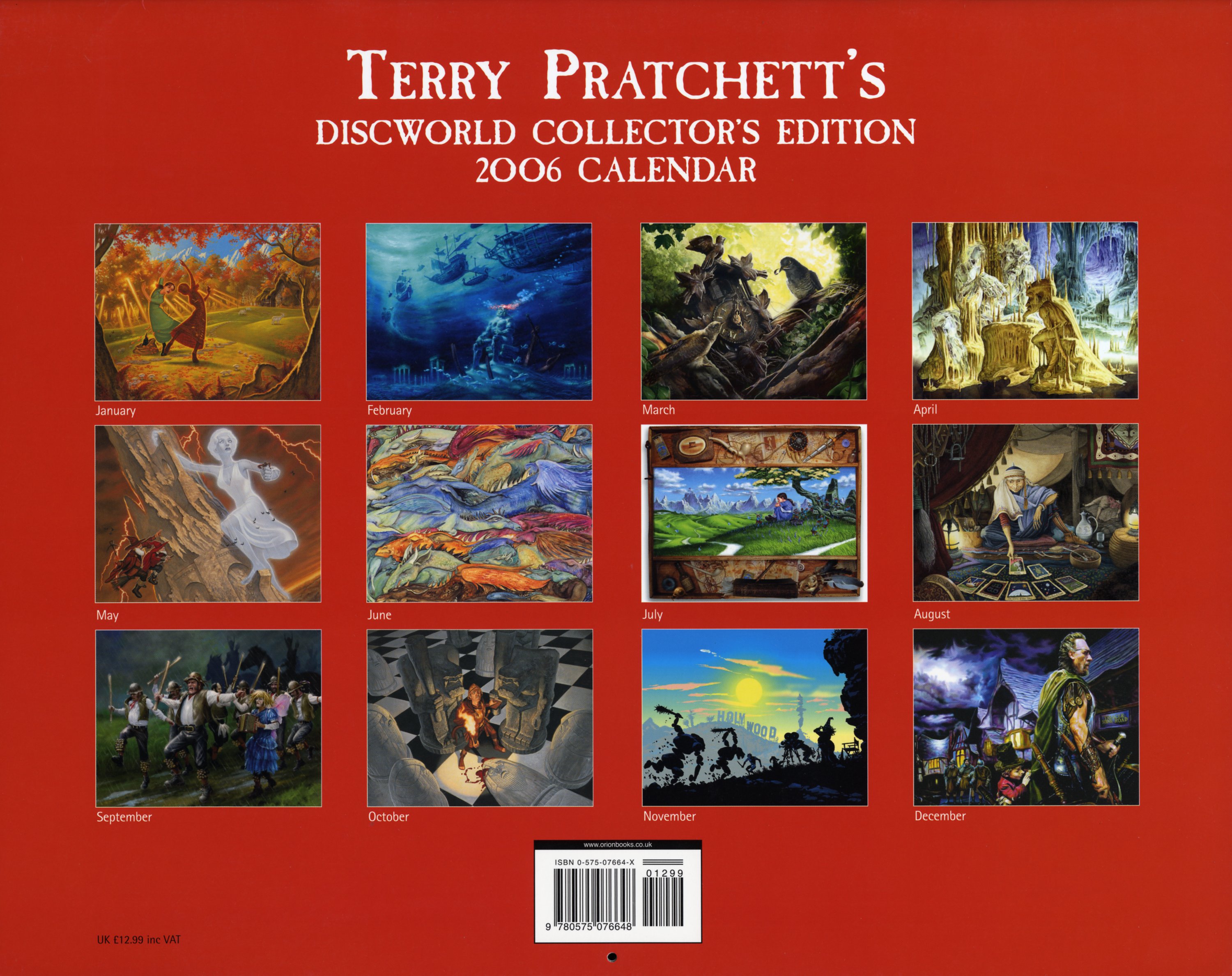 Edition 2006 de la collection des calendriers Discworld. Illustré par un collectif d’artistes dans lequel on trouve Sandy Nightingale, Jackie Morris, David Frankland, David Wyatt, Melvyn Grant, Dominic Harman, Stephen Player, Jon Sullivan et, bien sûr, Paul Kidby, le portraitiste préféré du Discworld de Terry Pratchett. C’est l’écrivain lui-même qui a choisi certaines de ses scènes préférées pour ce calendrier et notez, que c’est la seule fois où la couverture du nouveau roman de Discworld, Thud !, apparaît dans son intégralité, telle que l'artiste l'avait créée.