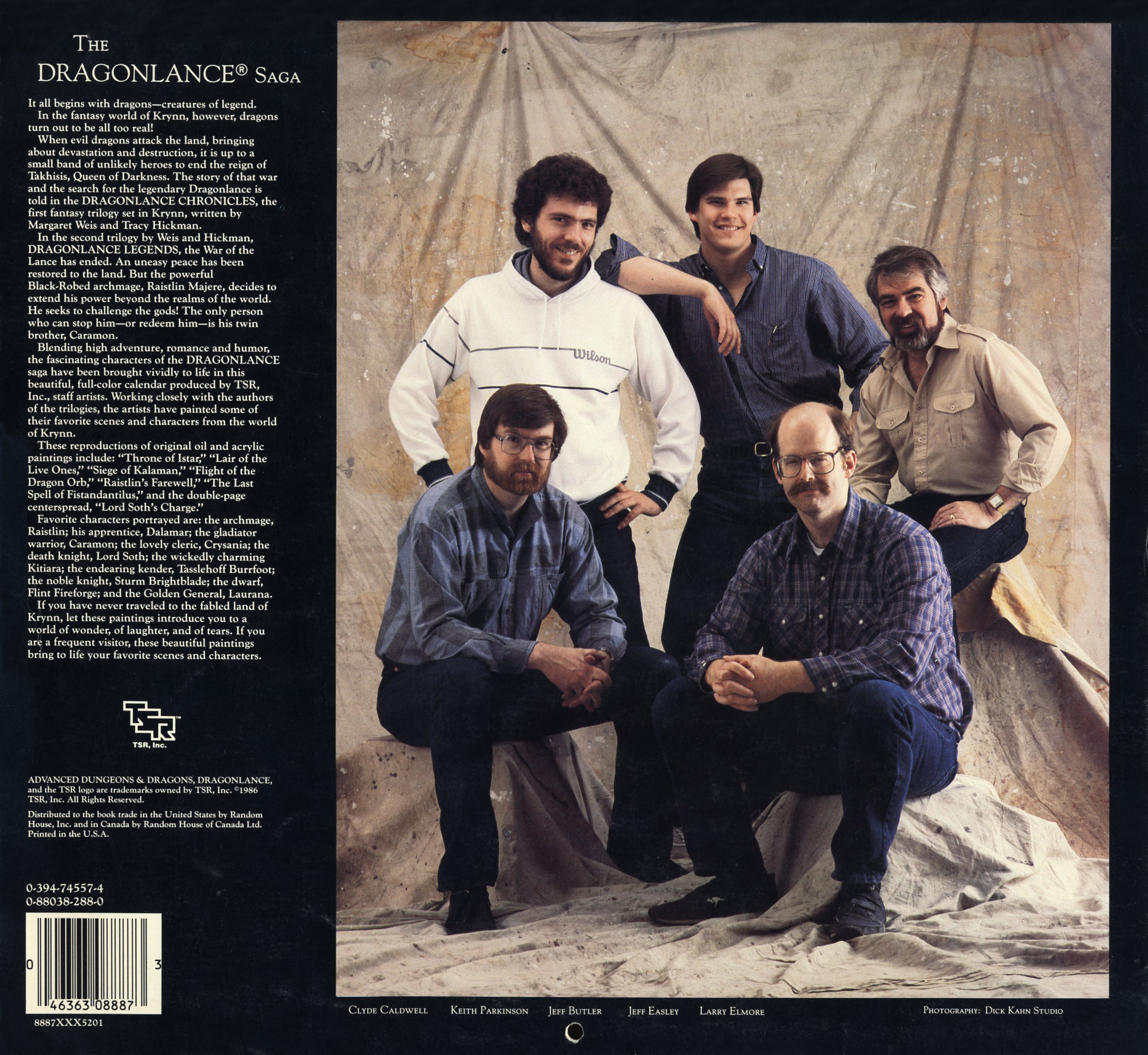 Mêlant aventure, romance et humour, les personnages fascinants de la saga Dragonlance prennent vie dans ce magnifique calendrier 1987 en couleurs, réalisé par les quatre artistes de TSR, Larry Elmore, Clyde Caldwell, Keith Parkinson et Jeff Easley. Etrangement aucune illustration de Jeff Butler n'est proposée dans le calendrier, alors que pourtant l'artiste apparaît sur la photo au dos du calendrier.