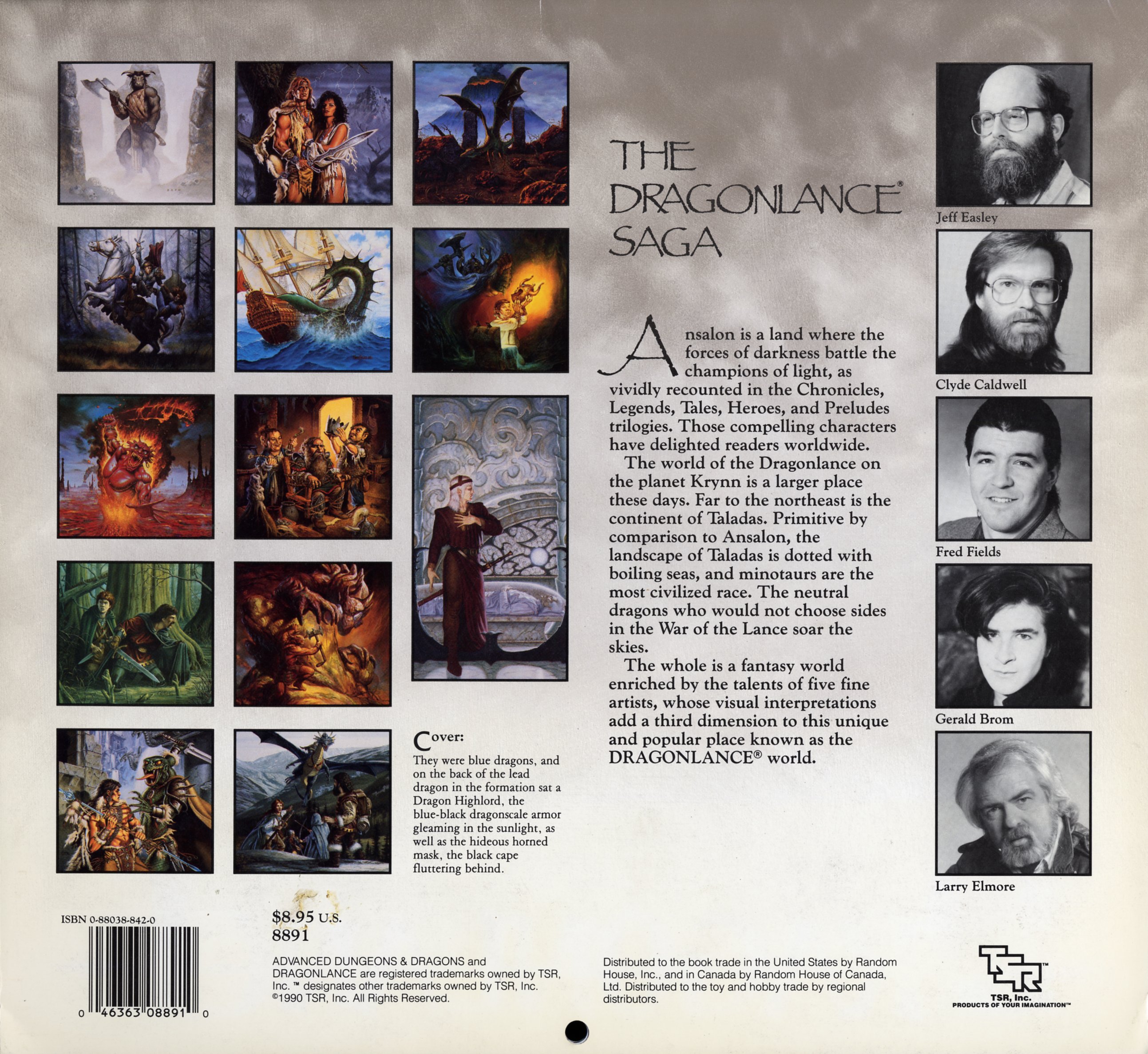 Ansalon est une terre où les forces des ténèbres combattent les champions de la lumière et le monde de Dragonlance, sur la planète Krynn, est aujourd'hui plus vaste. L'ensemble constitue un monde fantastique enrichi par les talents de cinq grands artistes, Jeff Easley, Clyde Caldwell, Fred Fields, Gerald Brom et Larry Elmore. Découvrez dans ce superbe calendrier 1991 leurs interprétations visuelles, qui ajoutent une troisième dimension à ce lieu unique et populaire qu'est le monde de Dragonlance.
