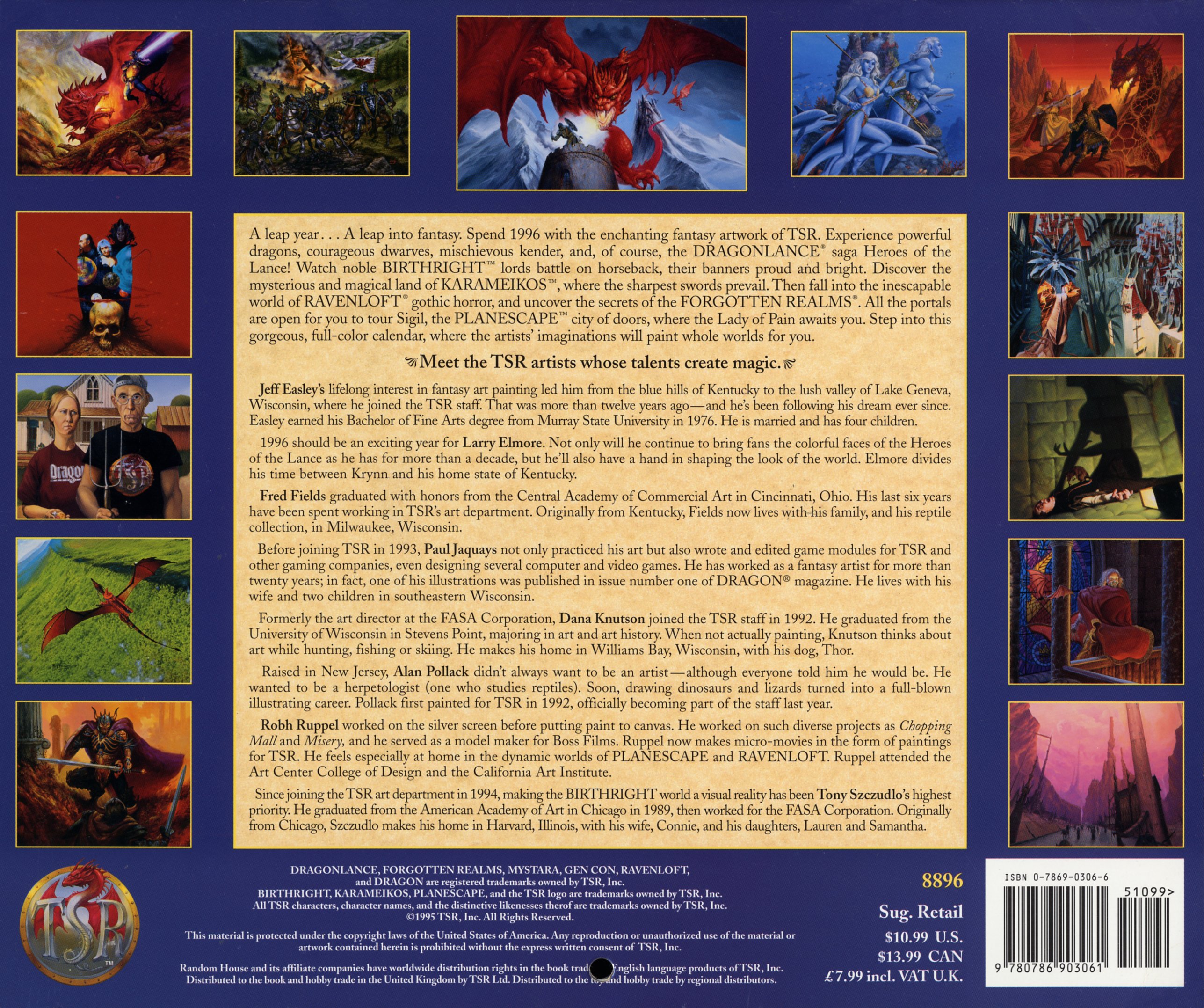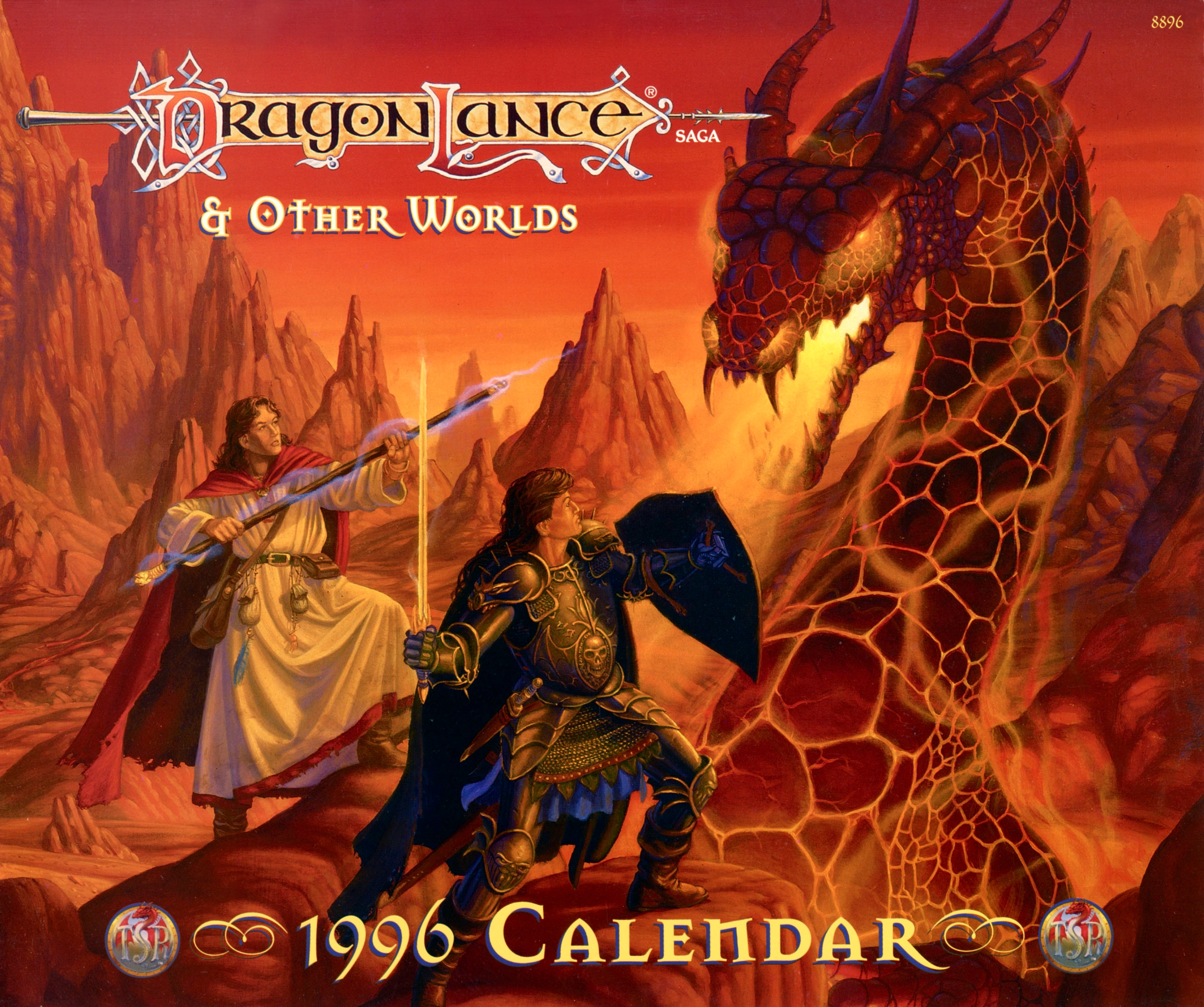 1996, une année bissextile... L’année d’un saut dans la fantasy. Passez l'année 1996 avec les enchanteresses œuvres de fantasy de TSR. Découvrez de puissants dragons, des nains courageux, des Kenders malicieux et, bien sûr, les Héros de la Lance de la saga Dragonlance! Admirez les nobles seigneurs Birthright combattant à cheval, leurs bannières fières et étincelantes. Découvrez le pays mystérieux et magique de Karameikos, où règnent les épées les plus tranchantes. Puis basculez dans le monde inéluctable de l'horreur gothique de Ravenloft et découvrez les secrets des Forgotten Realms. Tous les portails sont ouverts pour vous permettre de visiter Sigil, la célèbre Cité des portes de Planescape, où vous attend Lady of pain. Plongez dans ce magnifique calendrier Dragonlance 1996 tout en couleurs où l'imagination de huit artistes donne vie, rien que pour vous, à des mondes entiers.