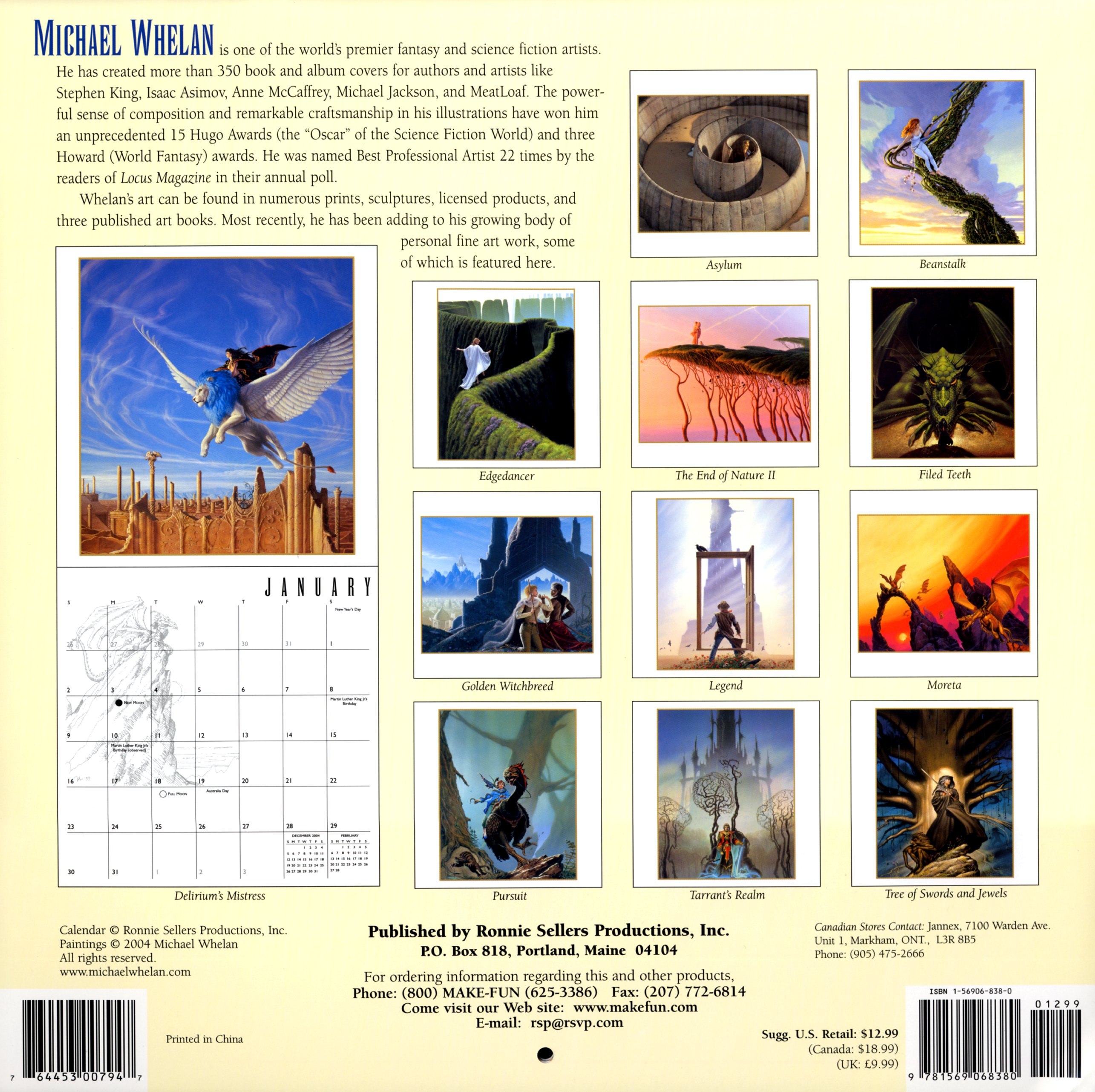Edition 2005 de la collection des calendriers Dragons & Mystics illustrée par Michael Whelan. L’artiste a créé plus de 350 couvertures de livres et d'albums pour des auteurs et des stars comme Stephen King, Isaac Asimov, Anne McCaffrey, Michael Jackson et Meat Loaf. L’occasion est donnée, avec ce nouveau calendrier, de découvrir un échantillon, petit par la taille mais grand par la qualité, de l’immense Œuvre de Michael Whelan.