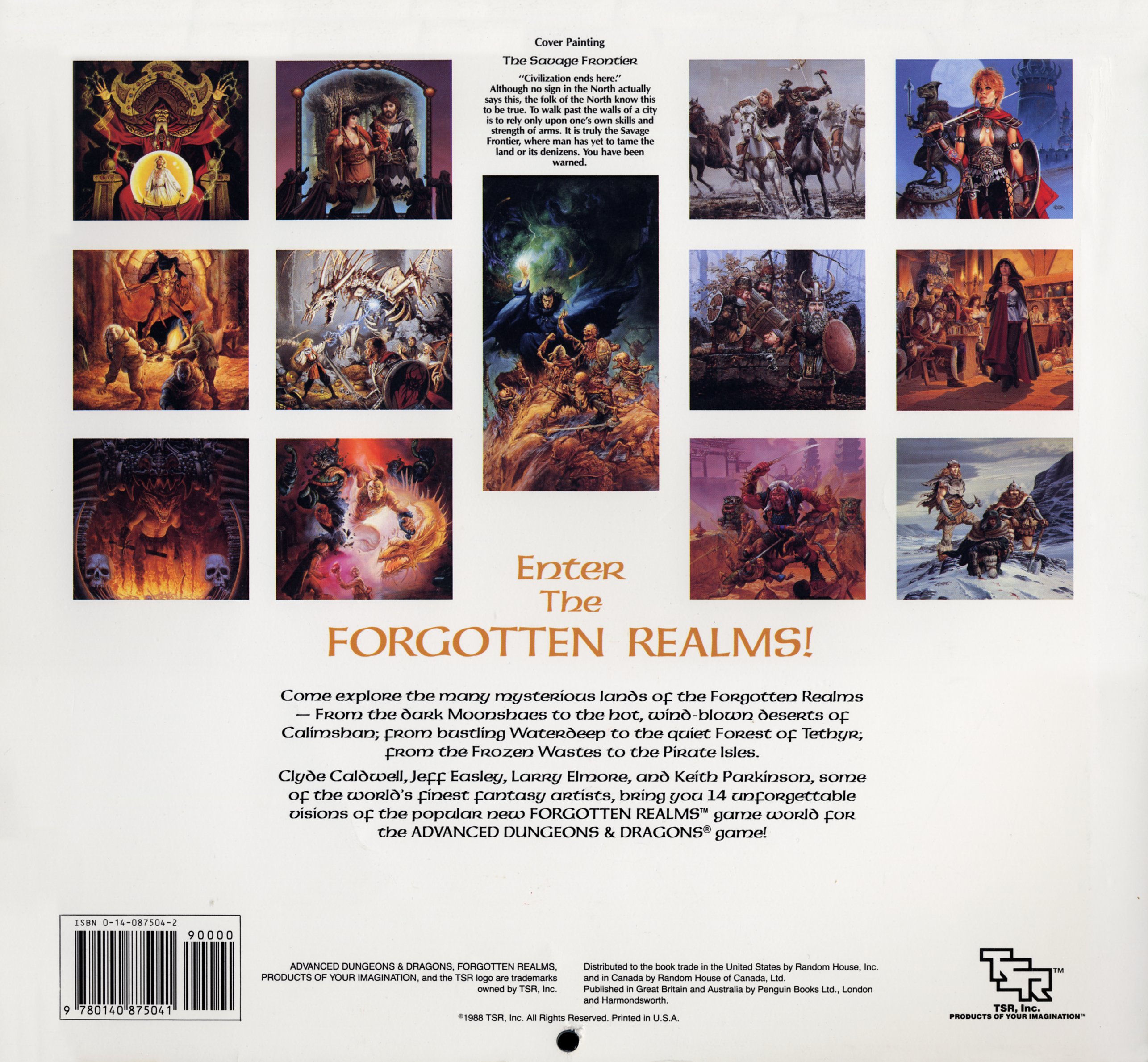 Avec ce nouveau calendrier Forgotten Realms 1989, venez explorer les nombreuses terres mystérieuses des royaumes oubliés. Des sombres Moonshaes aux déserts chauds et balayés par les vents de Calimshan, de l'agitation de Waterdeep à la tranquille Forêt de Tethyr, des Terres Glacées aux Îles des Pirates. Clyde Caldwell, Jeff Easley, Larry Elmore et Keith Parkinson, quatre des meilleurs artistes de fantasy au monde, vous offrent 14 visions inoubliables de Forgotten Realms, le nouvel environnement du célèbre jeu Advanced Dungeons & Dragons.