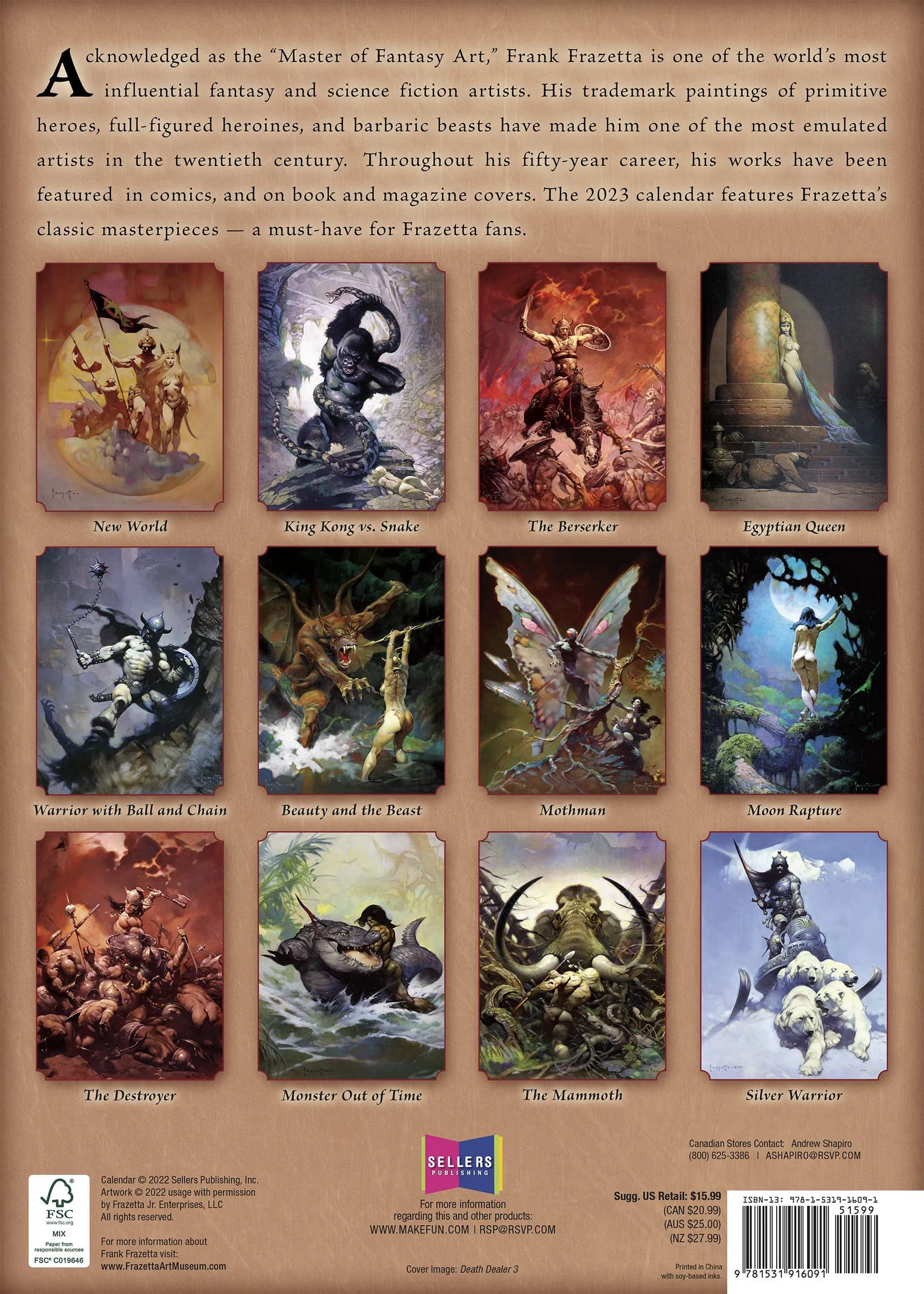 Reconnu comme le "Maître de l'art fantasy", Frank Frazetta est l'un des artistes de fantasy et de science-fiction les plus influents du XXe siècle. Ce calendrier 2023 rempli d’une sélection de ses chefs-d’œuvre de barbares, guerriers et bêtes malfaisantes, fera vibrer ses fans tout au long de l'année.