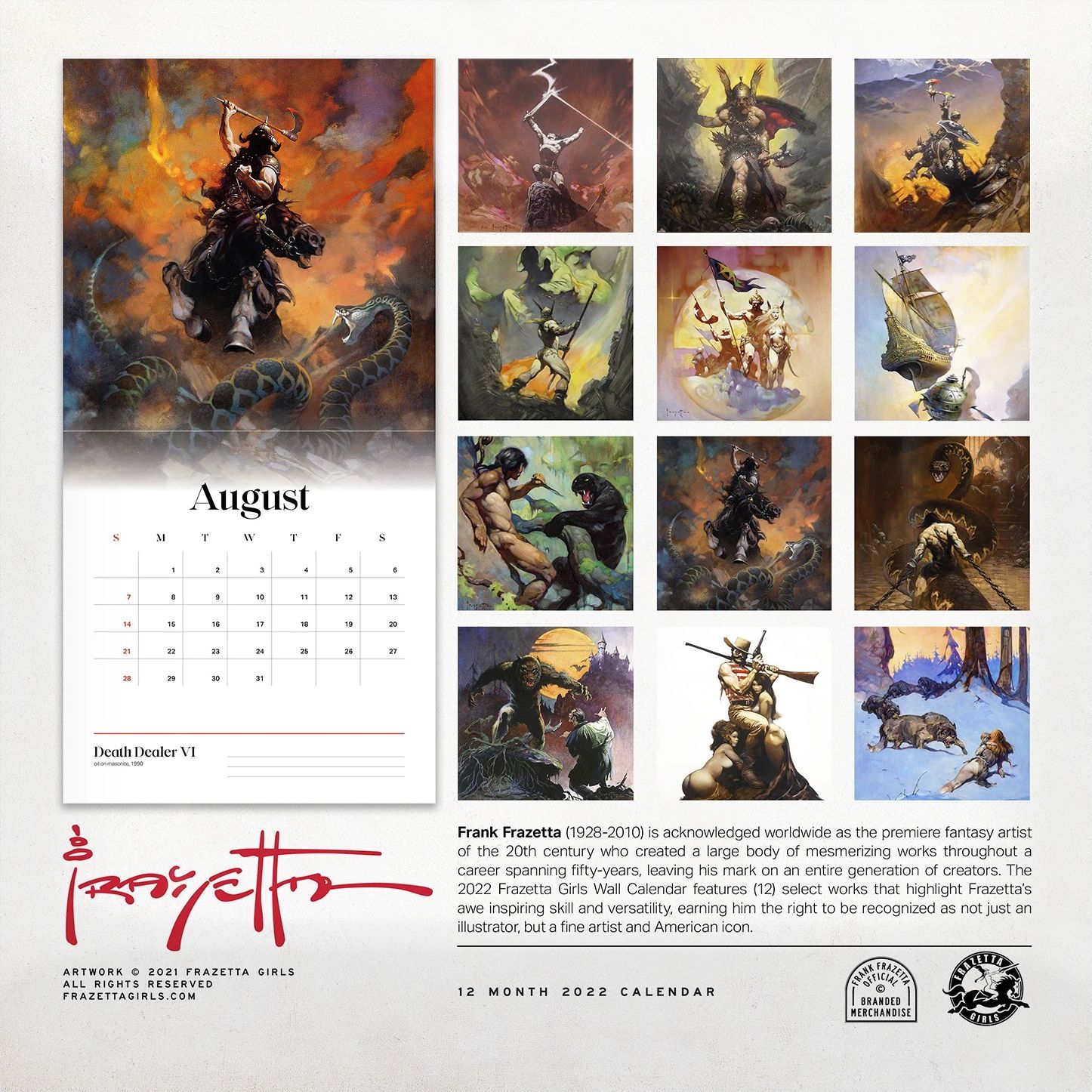 L’édition 2022 du calendrier Frazetta Girls propose 12 oeuvres caractéristiques parmi les plus emblématiques du "Godfather" de l’art fantasy. Les barbares et leurs haches, les mondes étrangers, les sensuelles "Frazetta Girls", le Death Dealer ou encore Conan, mettent en valeur les compétences et la polyvalence impressionnantes de Frank Frazetta, qui lui vallent le droit d'être reconnu non seulement comme un illustrateur, mais aussi comme un artiste accompli et une icône américaine de la peinture.