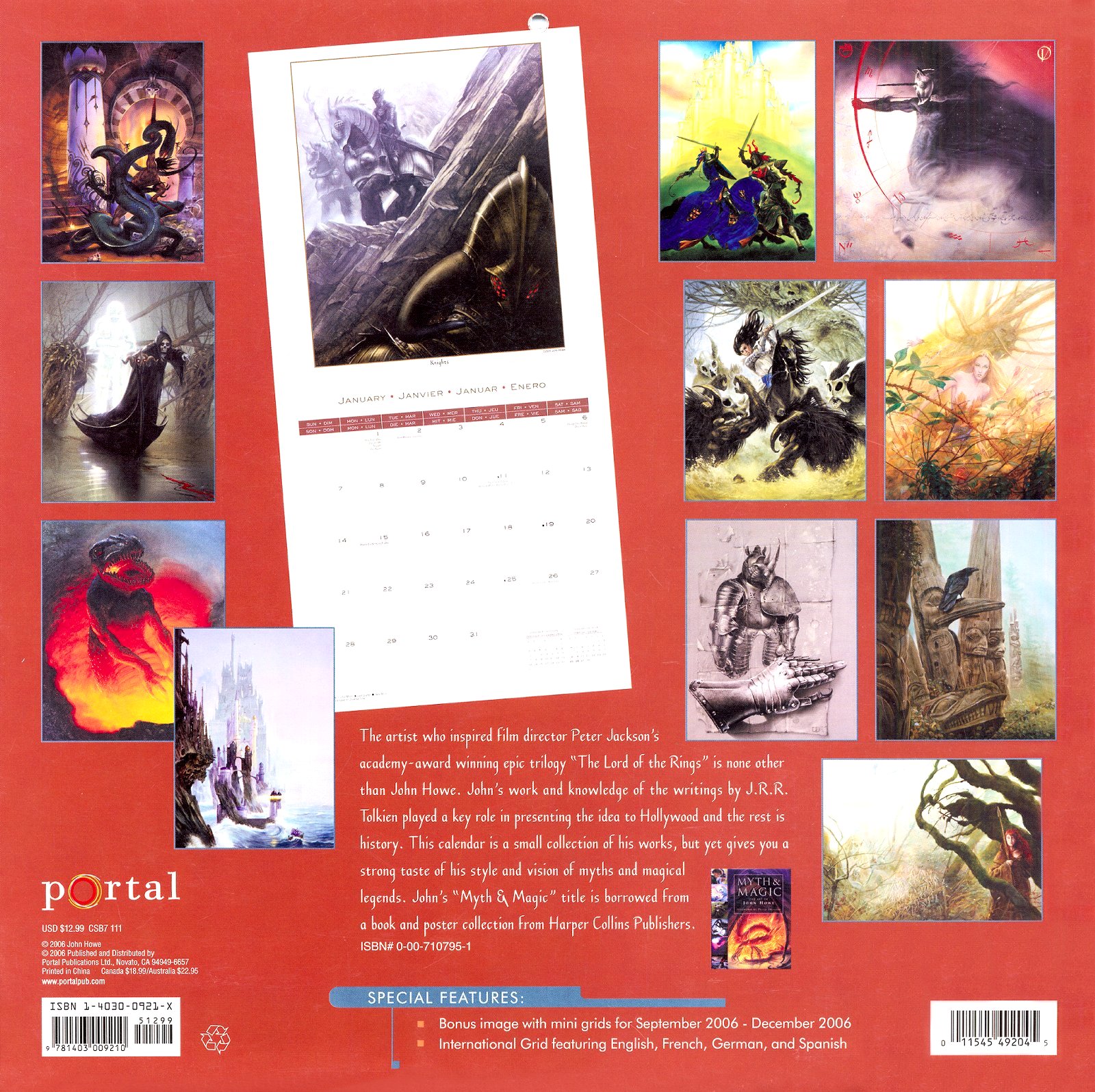 L'artiste qui a inspiré la Trilogie épique du réalisateur Peter Jackson, Lord of the Rings, n’est nul autre que John Howe. Son travail et sa connaissance des écrits de J.R.R. Tolkien ont joué un rôle clé dans la présentation du projet à Hollywood et le reste appartient à l'histoire. Si les illustrations de ce calendrier 2007 sont une infime partie de l’immense collection de ses œuvres, elles vous donnent un avant-goût de son style et de sa vision des mythes et des légendes magiques. Le titre "Myth & Magic" est emprunté à une collection de livres et d'affiches éditée par Harper Collins.