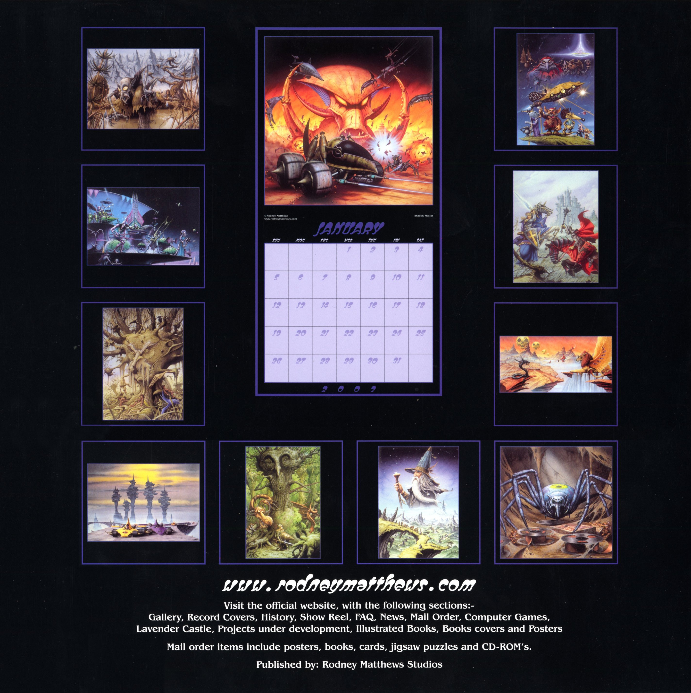 Ce calendrier 2003 tant attendu présente de nouvelles œuvres en couleur tirées du Seigneur des anneaux, quelques pochettes d'albums du groupe de rock Asia et l'affiche publicitaire de Lavender Castle, ainsi que des classiques comme Elric at the End of Time de Moorcock.