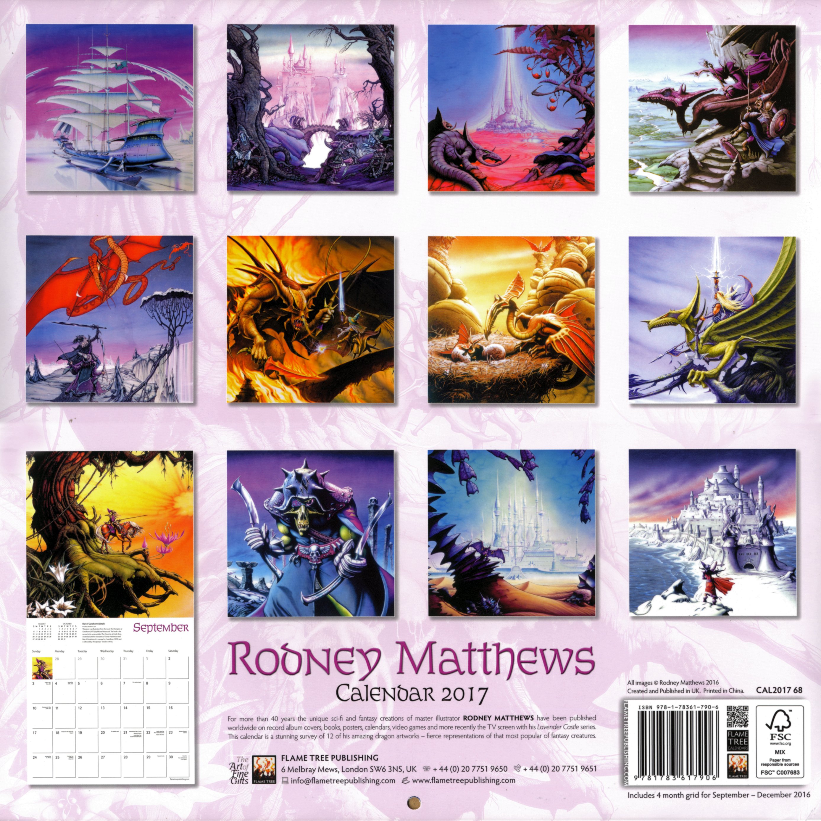 Depuis plus de 40 ans, les créations uniques de science-fiction et de fantasy du maître de l’illustration Rodney Matthews, ont été publiées dans le monde entier sur des pochettes d'albums, des livres, des posters, des calendriers, des jeux vidéo et plus récemment sur l'écran de télévision avec sa série Lavender Castle. Ce calendrier est un étonnant aperçu de 12 de ses incroyables œuvres d'art de dragon, d'intenses représentations de la plus populaire des créatures de fantasy.