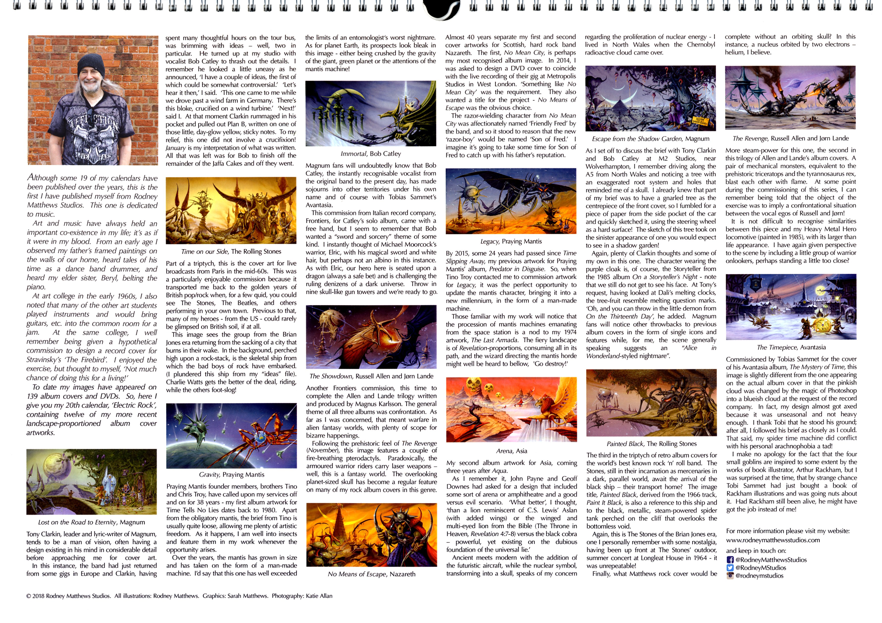 Electric Rock 2019 est un très grand calendrier au format paysage, comprenant 12 des dernières couvertures d'albums rock réalisées par Rodney Matthews. En complément, une page d'introduction nous dévoile les réflexions personnelles de l’artiste sur chacune de ses 12 illustrations. Electric Rock a remporté le prestigieux prix Best Bespoke Calendar lors des Calies 2018 (les UK Calendar Awards).