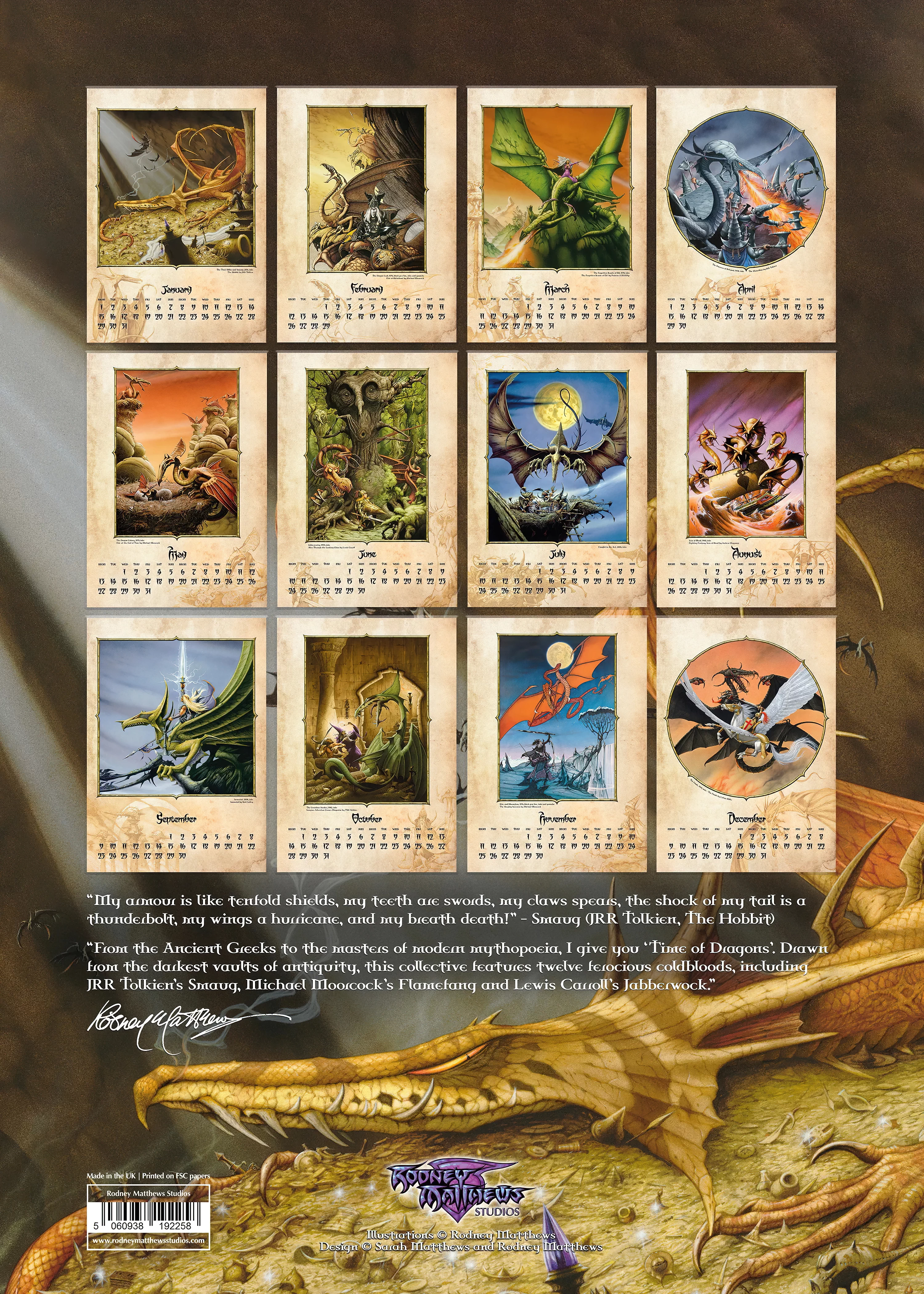 De la Grèce antique aux maîtres de la Mythopoeïa moderne, Rodney Matthews vous présente "Time of Dragons", l’édition 2024 de son calendrier. Tiré des profondeurs les plus sombres de l'antiquité, cette nouvelle édition propose une collection de douze terrifiantes illustrations à vous glacer le sang, dont Smaug de JRR Tolkien, Flamefang de Michael Moorcock et Jabberwock de Lewis Carroll.