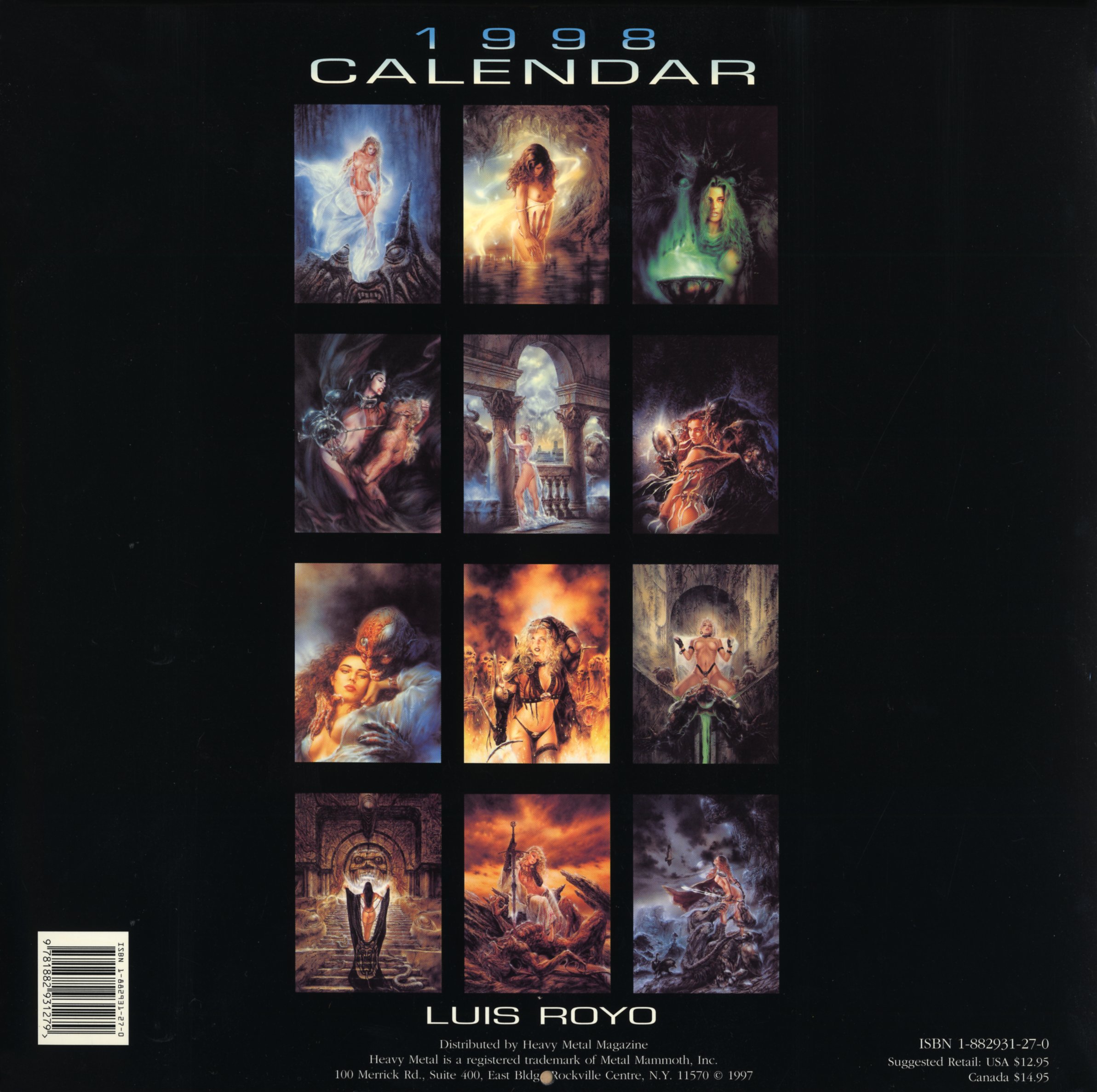 Edition 1998 de la collection des calendriers Luis Royo. Ce nouveau calendrier, distribué par Heavy Metal avec le logo NORMA Editorial sur la couverture, l’éditeur qui représente l’artsite à l’époque, propose 12 illustrations tirées du livre d’art