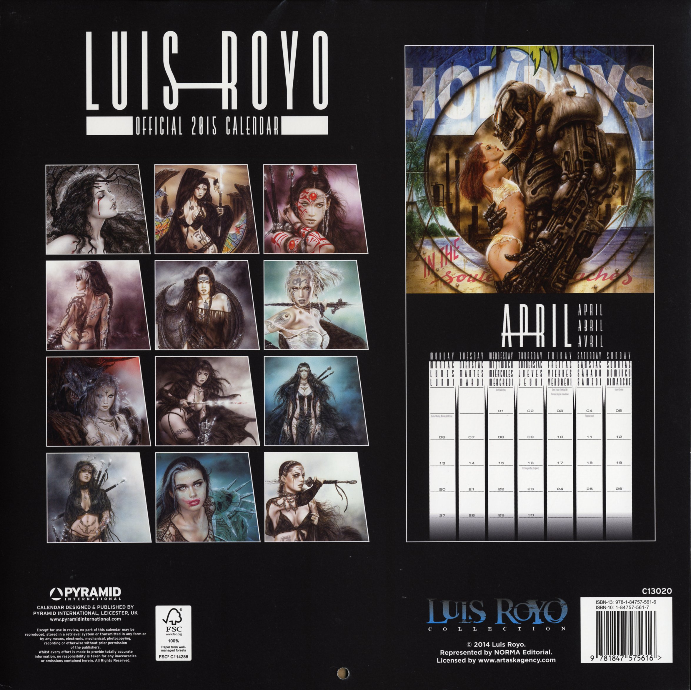 Edition 2015 de la collection des calendriers Luis Royo. Les illustrations sensuelles de femmes dans des paysages apocalyptiques et des mondes fantastiques présentées dans ce calendrier publié chez Pyramid, sont représentatives de la carrière de Luis Royo, un des illustrateurs les plus populaires et les plus prolifiques du monde.