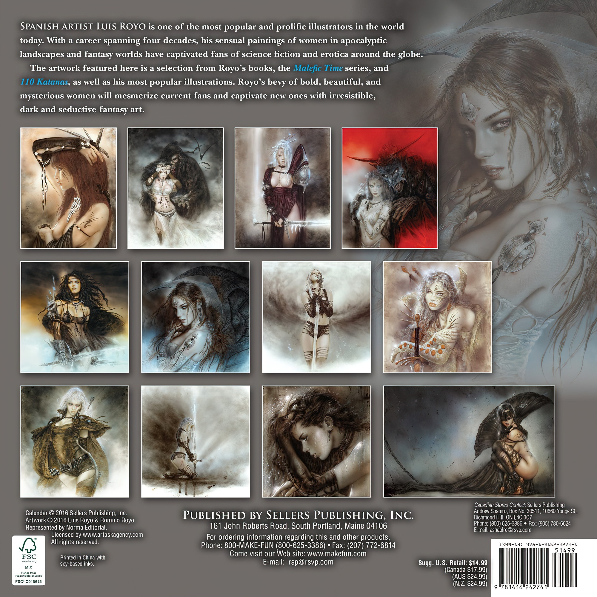 Les œuvres présentées dans ce nouveau calendrier 2017, sont une sélection des livres de Royo, de la série Malefic Time et de 110 Katanas, ainsi que de ses illustrations les plus populaires. La multitude de femmes audacieuses, belles et mystérieuses de Royo hypnotiseront les fans actuels et en captiveront de nouveaux grâce à un art fantasy irrésistible, sombre et séduisant.