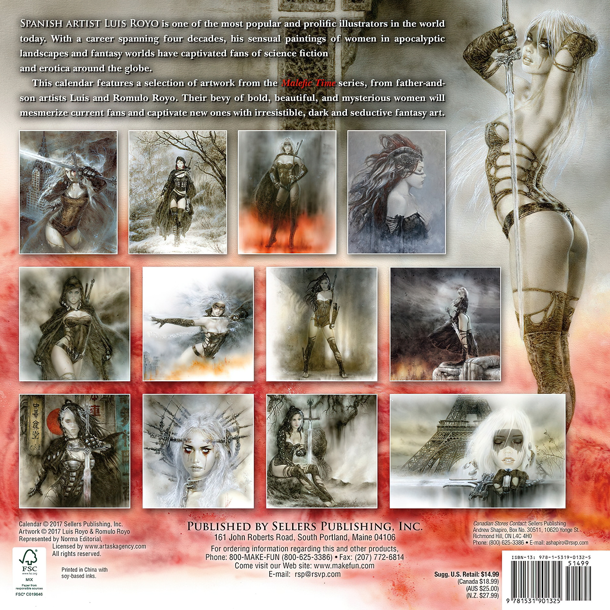 Ce calendrier propose une sélection d’illustrations tirées de la saga Malefic Time des artistes père et fils Luis et Romulo Royo. Leur multitude de femmes audacieuses, belles et mystérieuses hypnotiseront les fans actuels et en captiveront de nouveaux grâce à un art fantasy irrésistible, sombre et séduisant.