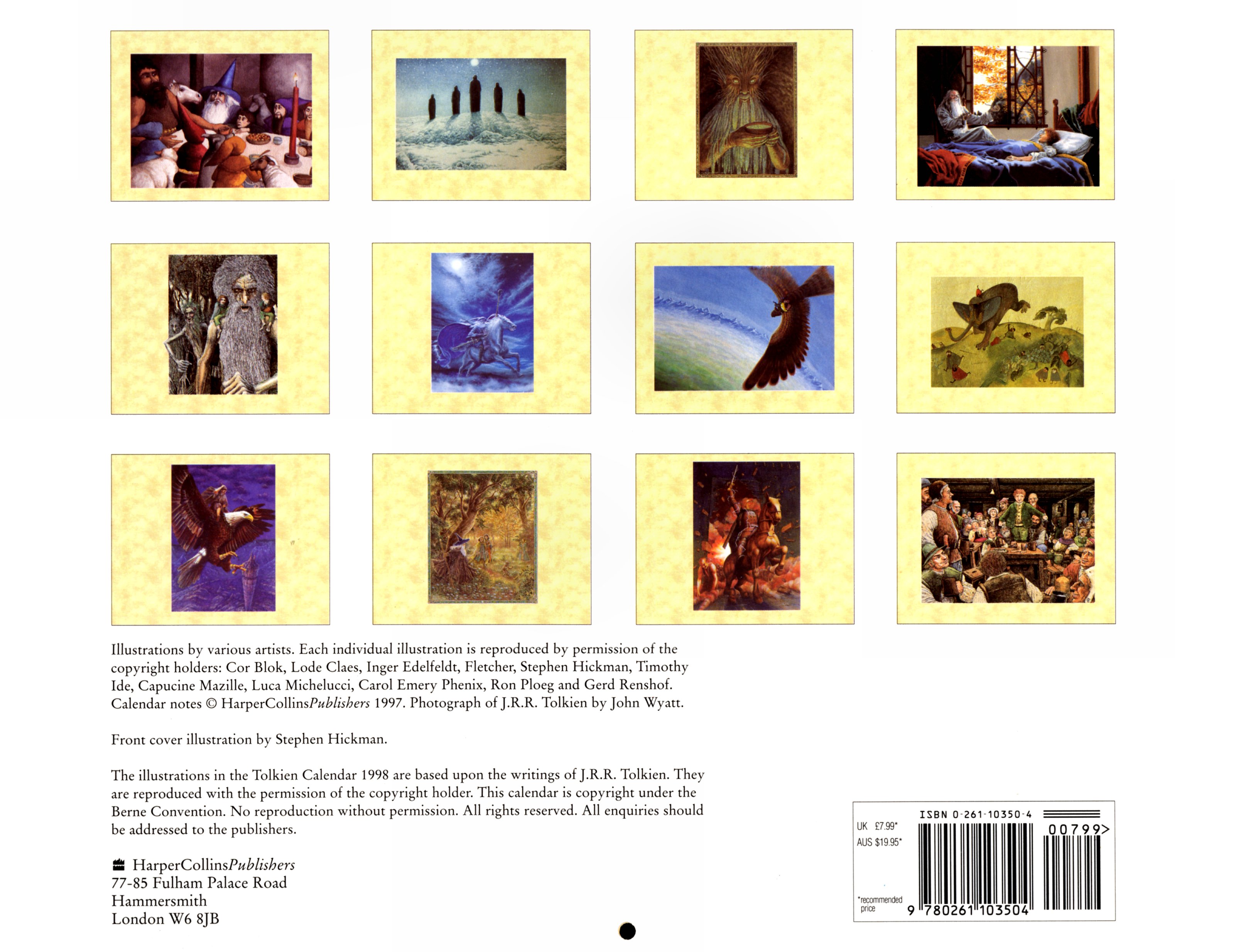 Edition 1998 de la collection des calendriers Tolkien. Nouvelle édition illustrée par un collectif de onze artistes.
