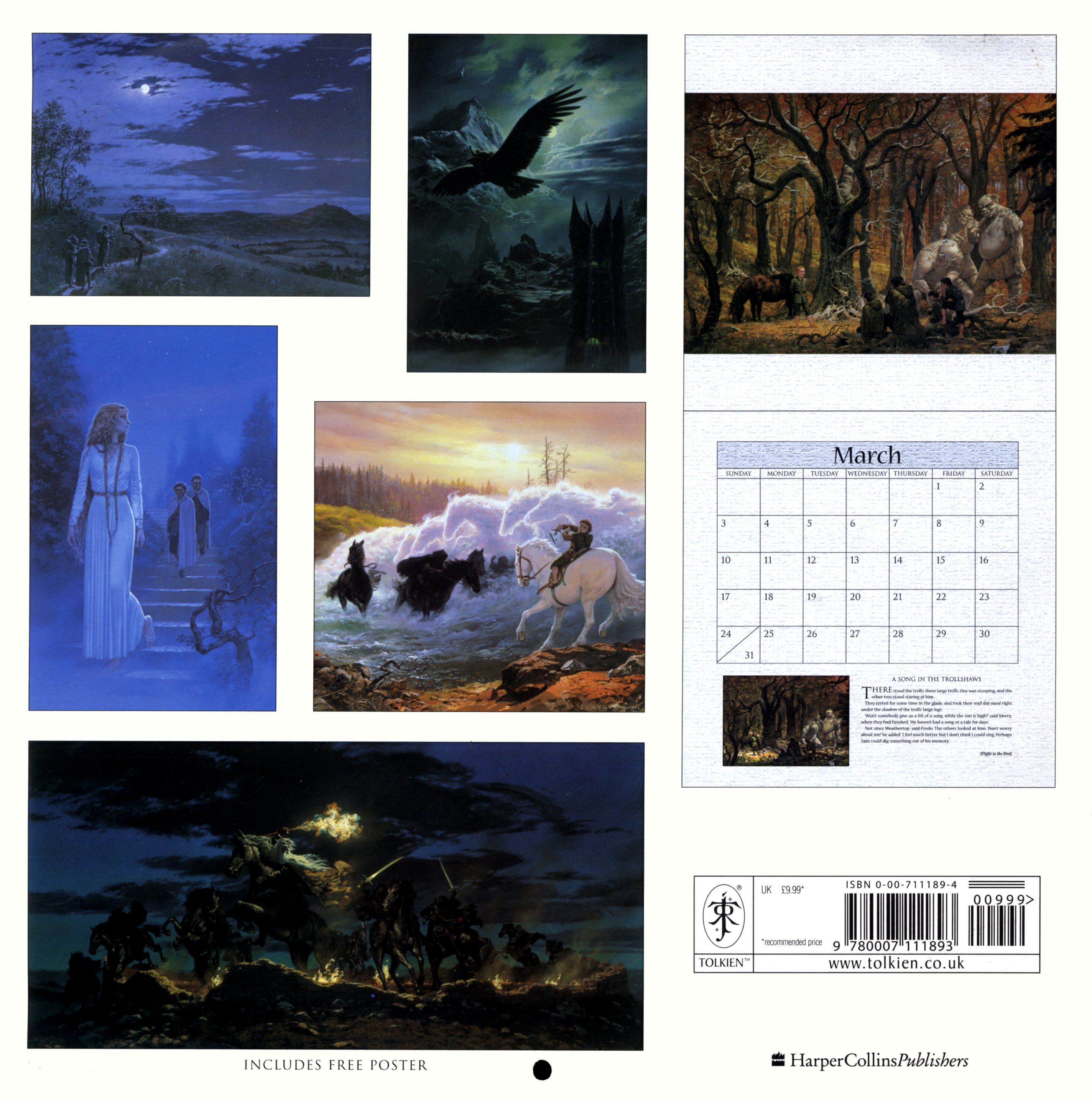 Edition 2002 de la collection des calendriers Tolkien. Ce calendrier propose les illustrations de Ted Nasmith tirées du premier volume de la trilogie The Lord of the Rings de Tolkien, afin de coïncider avec la sortie du film éponyme de New Line Cinema.