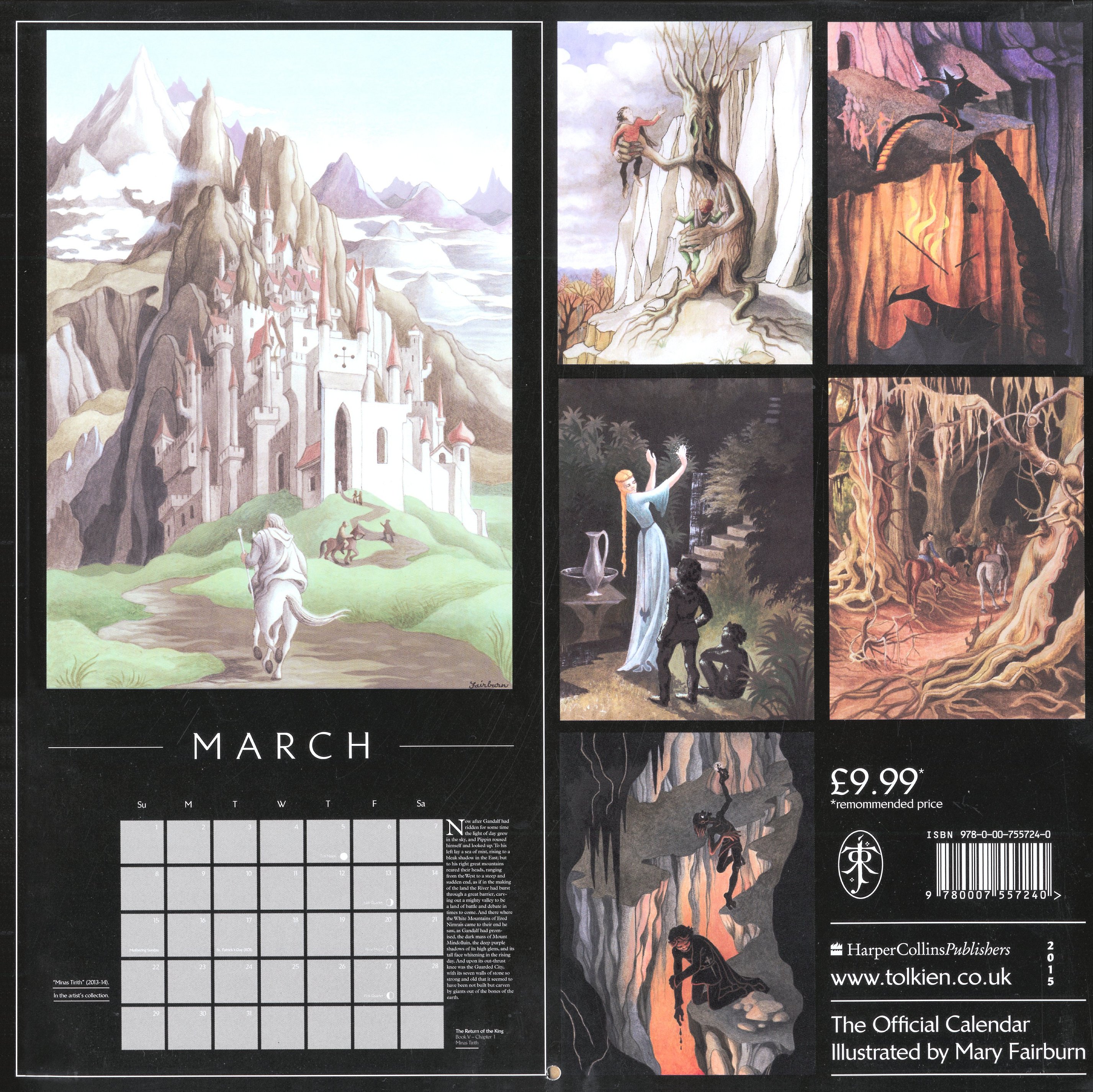 Edition 2015 de la collection des calendriers Tolkien. Illustré par Mary Fairburn, le calendrier présente des œuvres basées sur l’histoire du Seigneur des Anneaux.